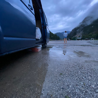 We had a lovely mountain picnic just over the border into Switzerland, and then realised that the weather was pulling in sharply behind us. For about 30 minutes of the descent we got soaked- but it was really quite refreshing compared to the oppressive heat of earlier. On the way down we were lucky enough to come across a very angry and noisy Marmot who wanted to let us know we were on his mountain. We then had to tackles a herd of cows coming up the very thin path in the opposite direction to us. A Mexican standoff ensued, with the predictable outcome of us climbing around the stubborn beasts as they firmly stood their ground! By the time we got back to the van, we were pretty broken- I was completely cooked in the heat, and Jackie simply got the bed out and had a nap.